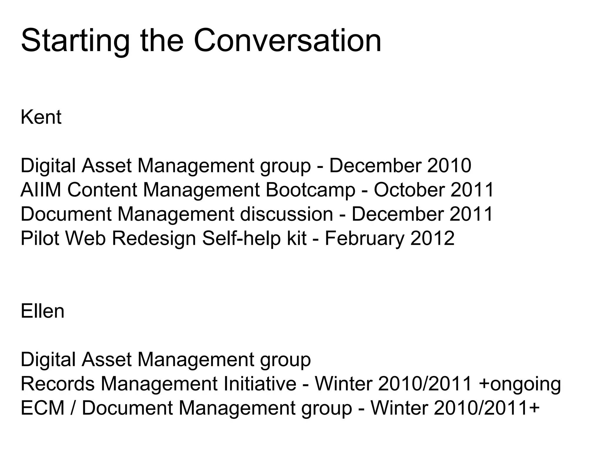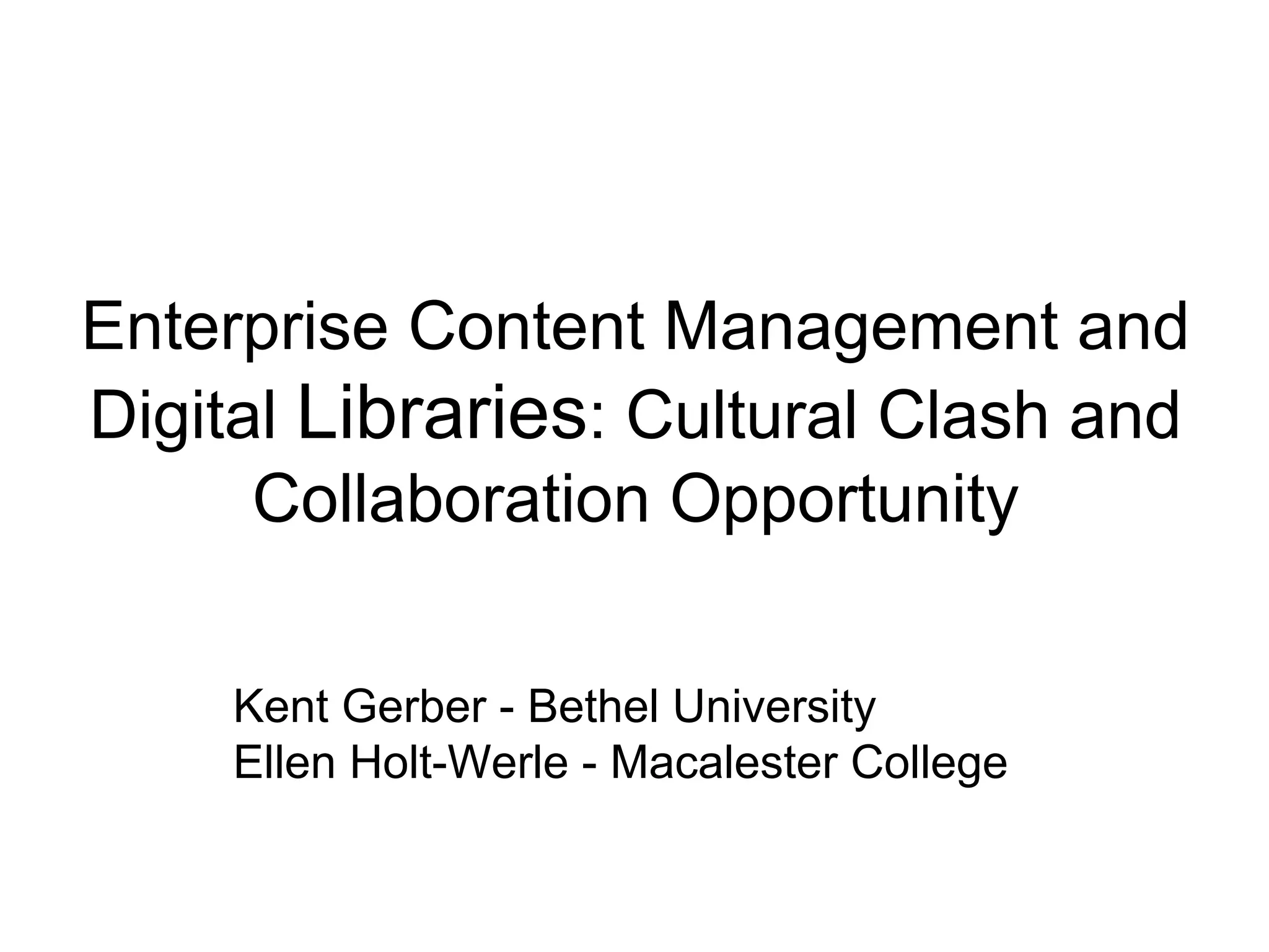 The document discusses the intersection of enterprise content management (ECM) and digital libraries, emphasizing the need for collaboration and understanding between these two areas within higher education. It outlines the goals, commonalities, and challenges faced by institutions in managing digital resources effectively while navigating external pressures for efficiency. The authors advocate for proactive conversations and shared strategies to enhance institutional value and address the complexities of digital information management.