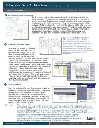 The document summarizes a 12-week project by Axis Information Architect to develop an enterprise data architecture for a private education lender. The project involved cataloging current systems, reports, and data flows. Axis created user personas and scenarios to understand how information is used. They defined a future state data flow and prioritized projects into a 24-month roadmap. The strategy effort resulted in consensus across the organization and alignment of IT initiatives with the strategic direction.