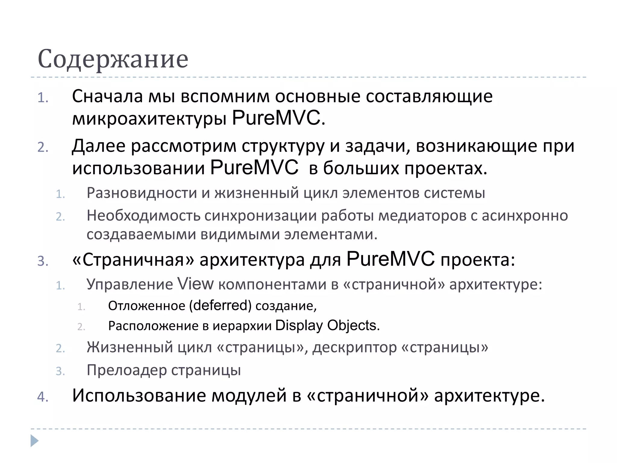 Документ описывает архитектуру Flex PureMVC для разработки корпоративных приложений, акцентируя внимание на микроархитектуре и управлении жизненным циклом компонентов. Обсуждаются основные задачи, такие как синхронизация медиаторов с асинхронно создаваемыми элементами и реализация 'страничной' архитектуры, чтобы эффективно работать с множеством форм и компонентов. Также рассматриваются механизмы предзагрузки данных и автоматизация процессов управления компонентами.