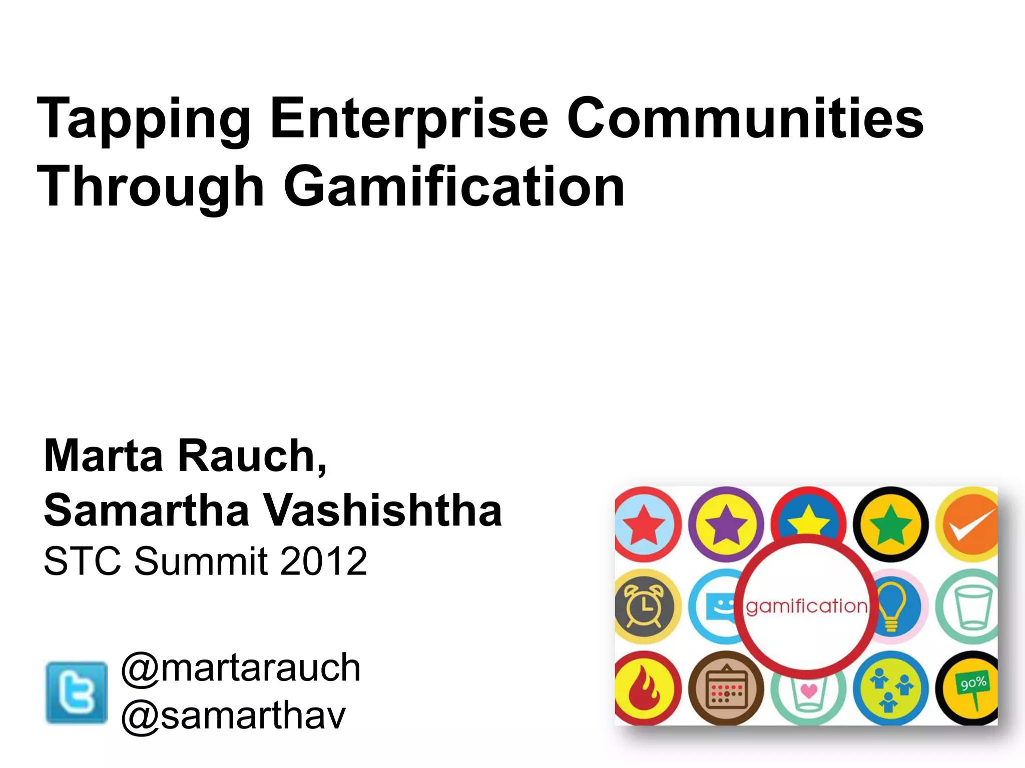 Marta Rauch presented on strategies for tapping into enterprise communities through gamification. She began with best practices for developing enterprise communities, such as understanding user needs, providing valuable content, and rewarding contributors. Rauch then discussed how gamification can motivate users in social media and the benefits it provides to enterprises, such as increased engagement and productivity. Examples of successful gamified enterprise communities included leaderboards, badges, points systems, and status displays. Rauch concluded with tips for technical communicators on skills like understanding player motivation and providing feedback to guide players in gamified systems.
