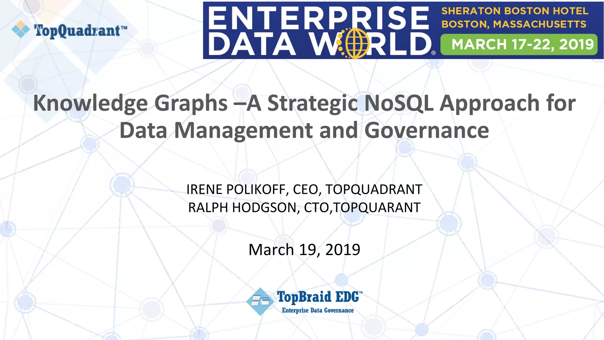 The document discusses the role of knowledge graphs in data management and governance, highlighting their ability to represent knowledge as interconnected graphs rather than traditional tables. It addresses challenges in data governance and proposes knowledge graphs as a solution to integrate diverse data sources and enhance compliance with regulations like GDPR. Additionally, it outlines how knowledge graphs facilitate better decision-making by enriching data and supporting common searches across business and regulatory contexts.