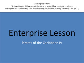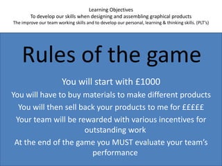 The document outlines the rules and objectives of an enterprise game where students will form teams to design and produce graphical products to sell for money. The goals are to improve skills in designing products, teamwork, and personal learning. Teams will be given £1000 to buy materials and make items to sell back for profit. The best performing teams will receive incentives, and teams must evaluate their work at the end. Specific roles like team leader and quality control manager are mentioned. A list of materials and products with prices is provided.