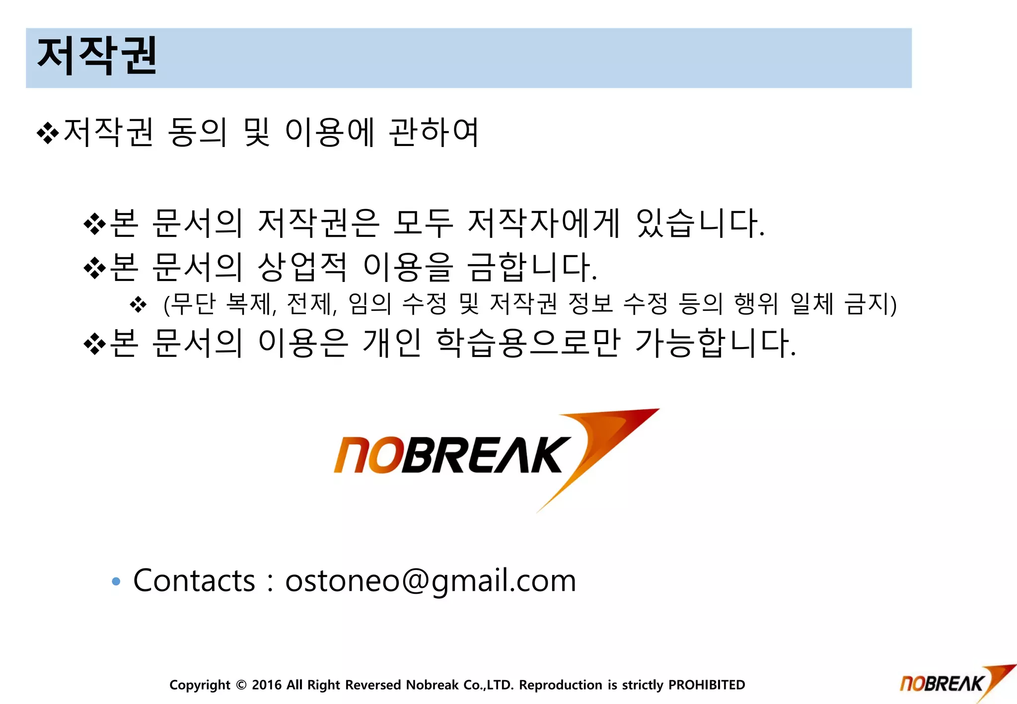 All Right Reversed Nobreak Co.,LTD. Reproduction is strictly PROHIBITED 시스템 전원 관리 시스템 power-off [root@el7 ~]# systemctl poweroff 시스템 emergency (rescue와 유사 , root 파일시스템만 읽기 전용) [root@el7 ~]# systemctl emergency 시스템 halt ( 종료 , 전원은 안꺼짐 ) [root@el7 ~]# systemctl halt 시스템 reboot (재부팅) [root@el7 ~]# systemctl reboot 시스템 suspend (시스템 정지) [root@el7 ~]# systemctl suspend 시스템 hibernate (하이버네이션 상태) [root@el7 ~]# systemctl hibernate
