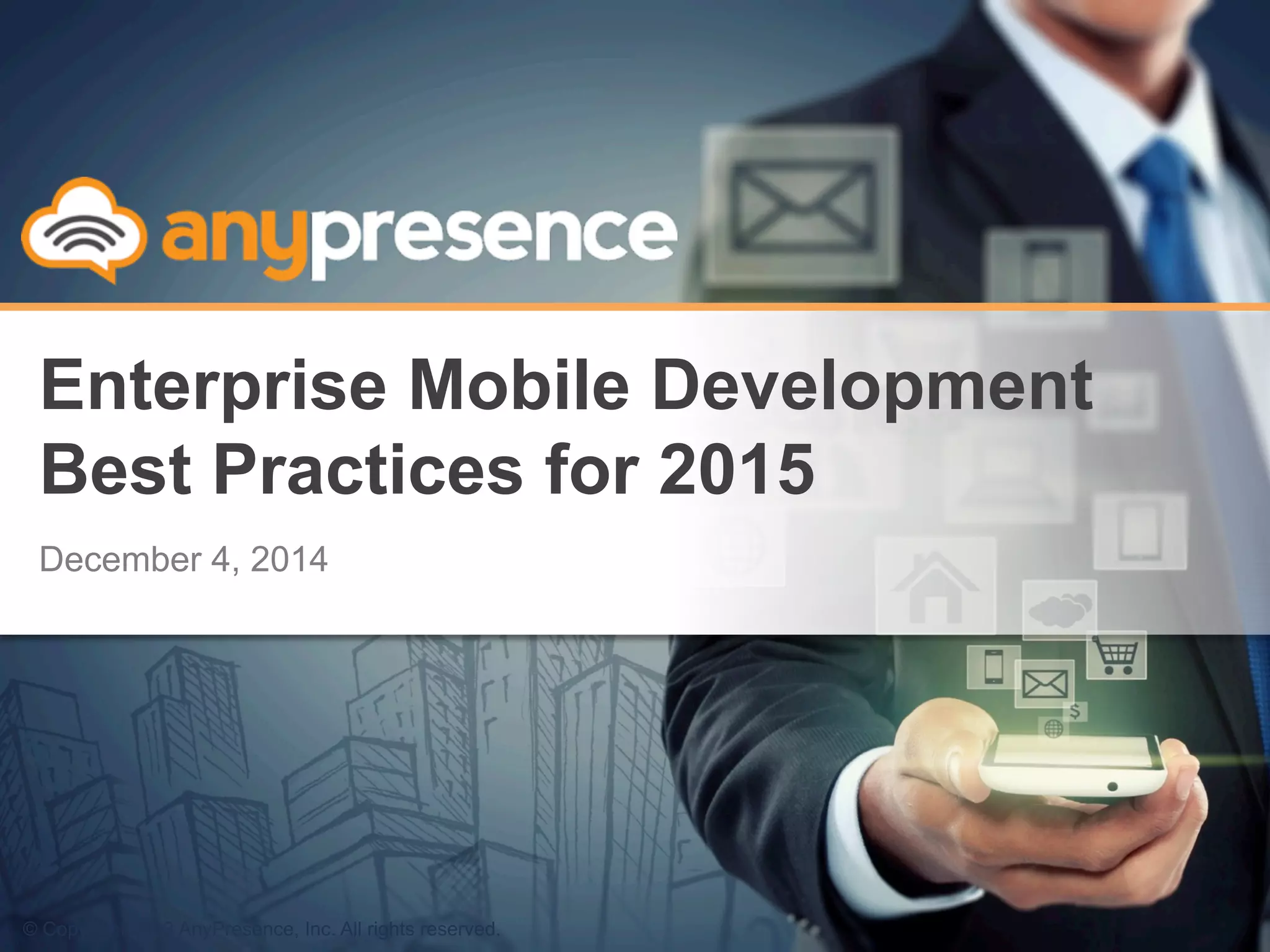 This document summarizes a webinar on enterprise mobile development best practices for 2015. It discusses the rapid evolution of mobile operating systems and increasing complexity of mobile apps. It also covers challenges for mobile developers, different application development approaches, and considerations for which approach to take. Modern mobile architectures using mobile backend as a service (MBaaS) are presented as reducing development time and costs while focusing on functionality over infrastructure.