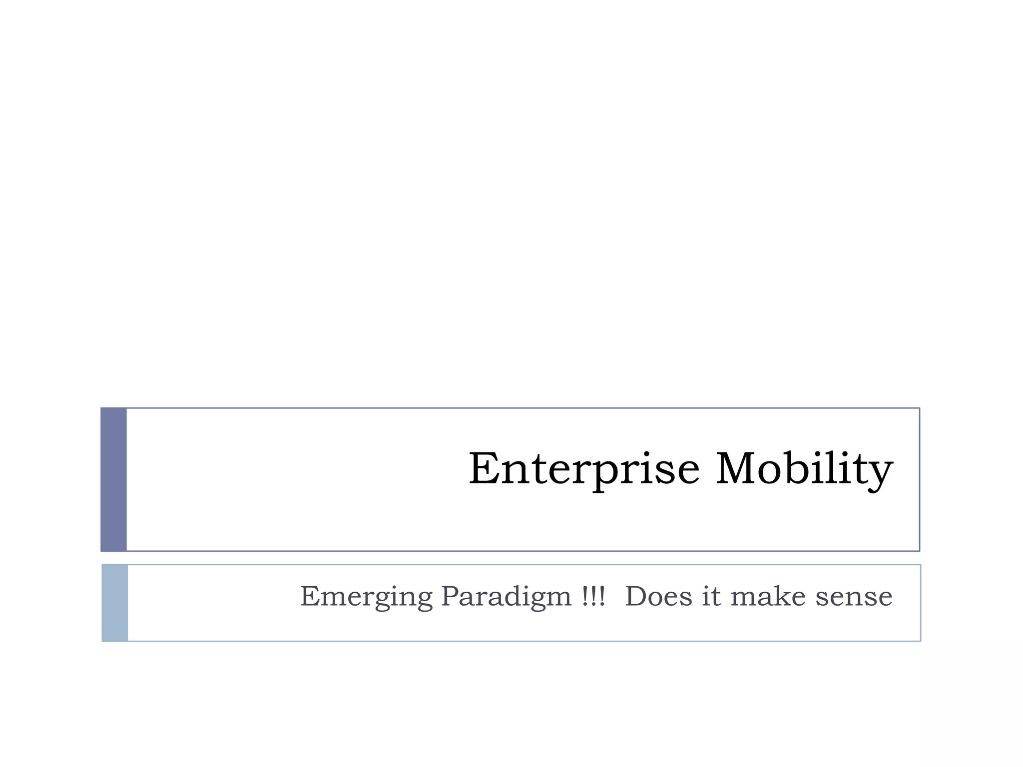 Enterprise mobility refers to mobile devices, networks, services, applications, and solutions. It involves mobile application development, lifecycle management, and managed mobility services like mobile device management and security. Mobility is driving changes in IT as personal devices are used for work. Many organizations are developing mobile apps and supporting BYOD. Mobility poses new challenges for security, management, integration and costs. While mobility adoption is increasing, enterprises face challenges from the fragmented market and balancing user and organizational needs.