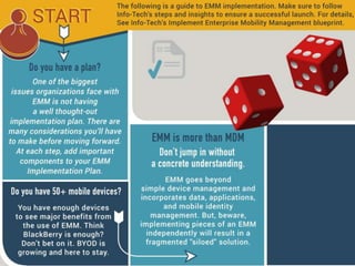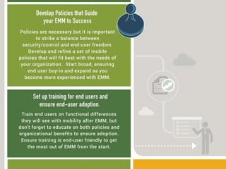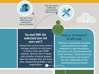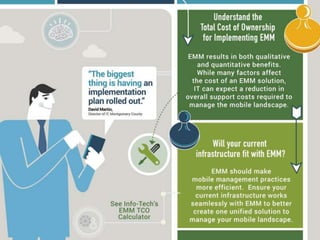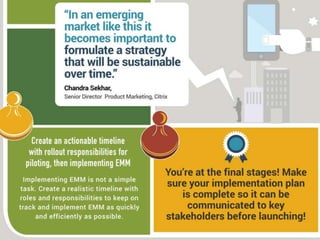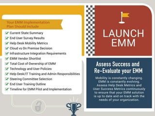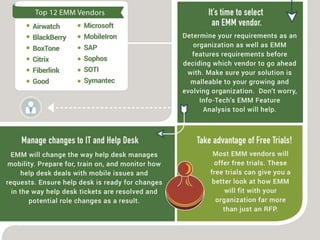 The document discusses the evolution of enterprise mobility management (EMM) and its shift from mobile device management (MDM) to a broader focus on managing applications and content. It highlights the challenges of BYOD and the need for advanced features beyond basic MDM, urging companies to prioritize application and content management when selecting vendors. Additionally, it notes the trend toward a unified management solution across various platforms including mobile, Windows, OSX, and IoT.