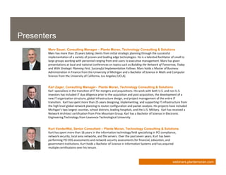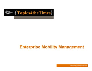 This document provides an overview of enterprise mobility management. It discusses the importance of developing a strategic approach and comprehensive plan for managing mobile devices, applications, and services. The presentation covers key considerations like device ownership, security best practices, and total cost of ownership. It also outlines the components of an effective mobility management process, including policy, architecture, tools, and procedures. Managing security risks associated with mobile access is a major focus. The webinar aims to help organizations transform their business through mobilization while maintaining appropriate controls.