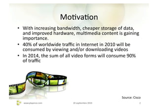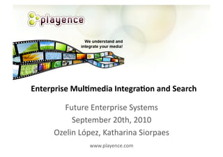 The document discusses the importance of multimedia integration and search within enterprises, highlighting a growing trend where video content will dominate internet traffic by 2014. It addresses the challenges of annotating, managing, and searching multimedia assets, noting that current systems rely heavily on manual processes. Playence Media is introduced as a solution to enhance multimedia management through automatic semantic annotation, in-video search capabilities, and support for various languages and formats.