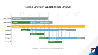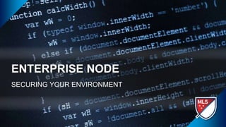 This document discusses securing an enterprise Node.js environment. It recommends using Node LTS versions for stability, containerizing applications for isolation, and securing dependencies by whitelisting modules. It also covers authenticating users with JWT, authorizing access with scopes and roles, validating input data, encrypting sensitive data, and ensuring HTTPS is used everywhere. Securing the runtime is important to protect the company from threats, improve confidence, and meet regulations.