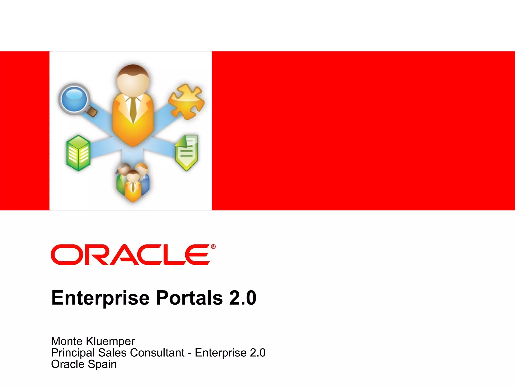 The document discusses how enterprise portals have evolved with the rise of Web 2.0. It describes how users now expect to generate and share their own content, provide feedback, and mashup data and components. It also outlines Oracle's enterprise 2.0 strategy to infuse Web 2.0 technologies into existing systems to transform how users work within companies by providing information in context and enabling participation. Key elements of Oracle's strategy include its WebCenter Suite, content management tools, and collaborative services to deliver a user-centric platform.
