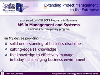 The document discusses enterprise project management and summarizes key points from several presentations on the topic. It describes how establishing consistent project management processes, practices, standards, and roles can help align strategy with project execution. It also emphasizes that implementing enabling technologies and changing organizational culture are important for effective enterprise project management.
