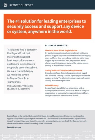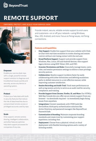 BeyondTrust provides a comprehensive remote support solution that empowers service desk representatives to diagnose and troubleshoot issues securely across diverse devices and operating systems. The platform includes features such as chat support, granular permissions, session recording, and integrations with ITSM tools, enhancing operational efficiency and compliance. With flexible deployment options and a focus on maximizing value, BeyondTrust is trusted by 20,000 customers for its strong security and support capabilities.