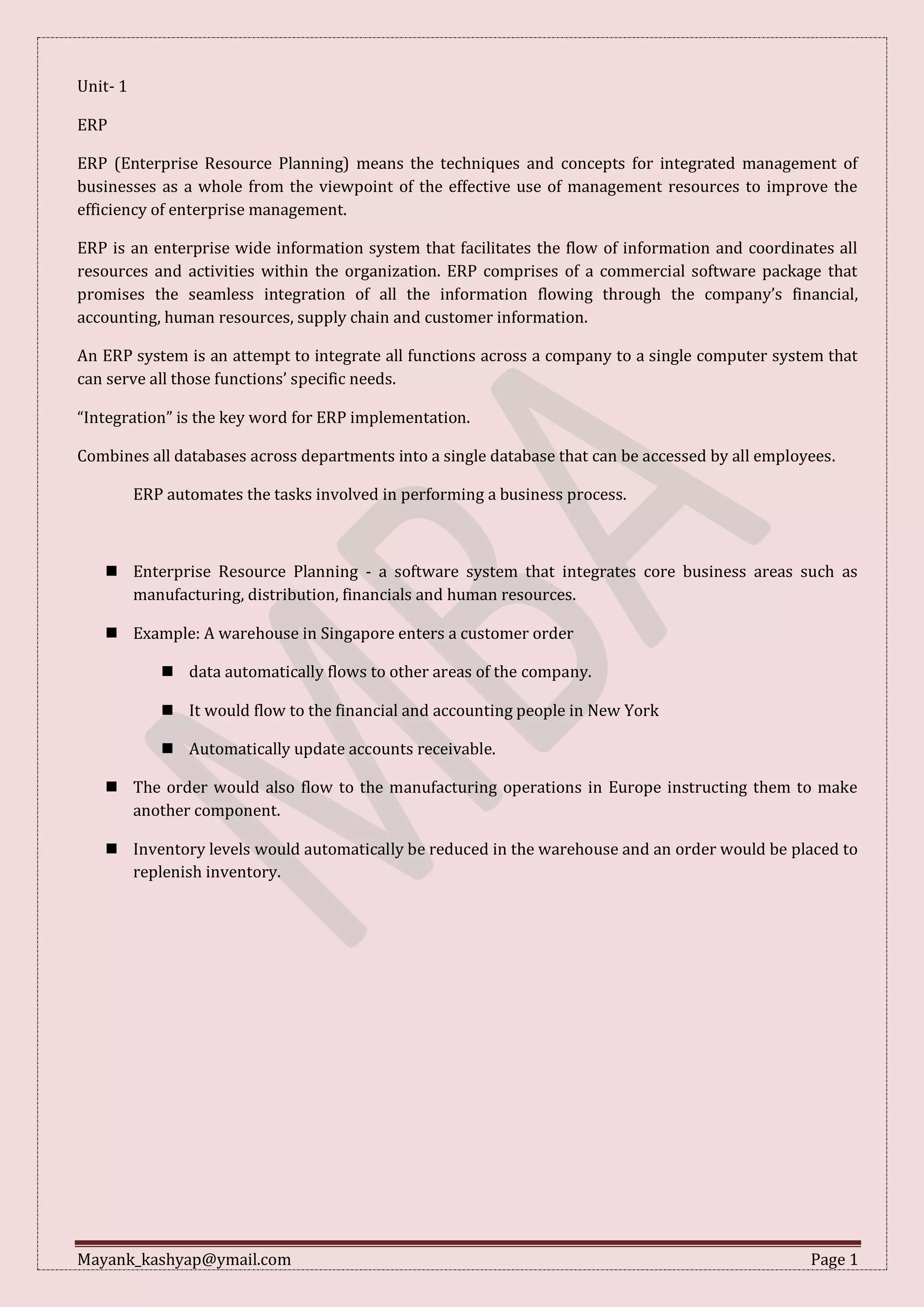 1. ERP aims to integrate information flow and coordinate all resources/activities within an organization through a commercial software package.