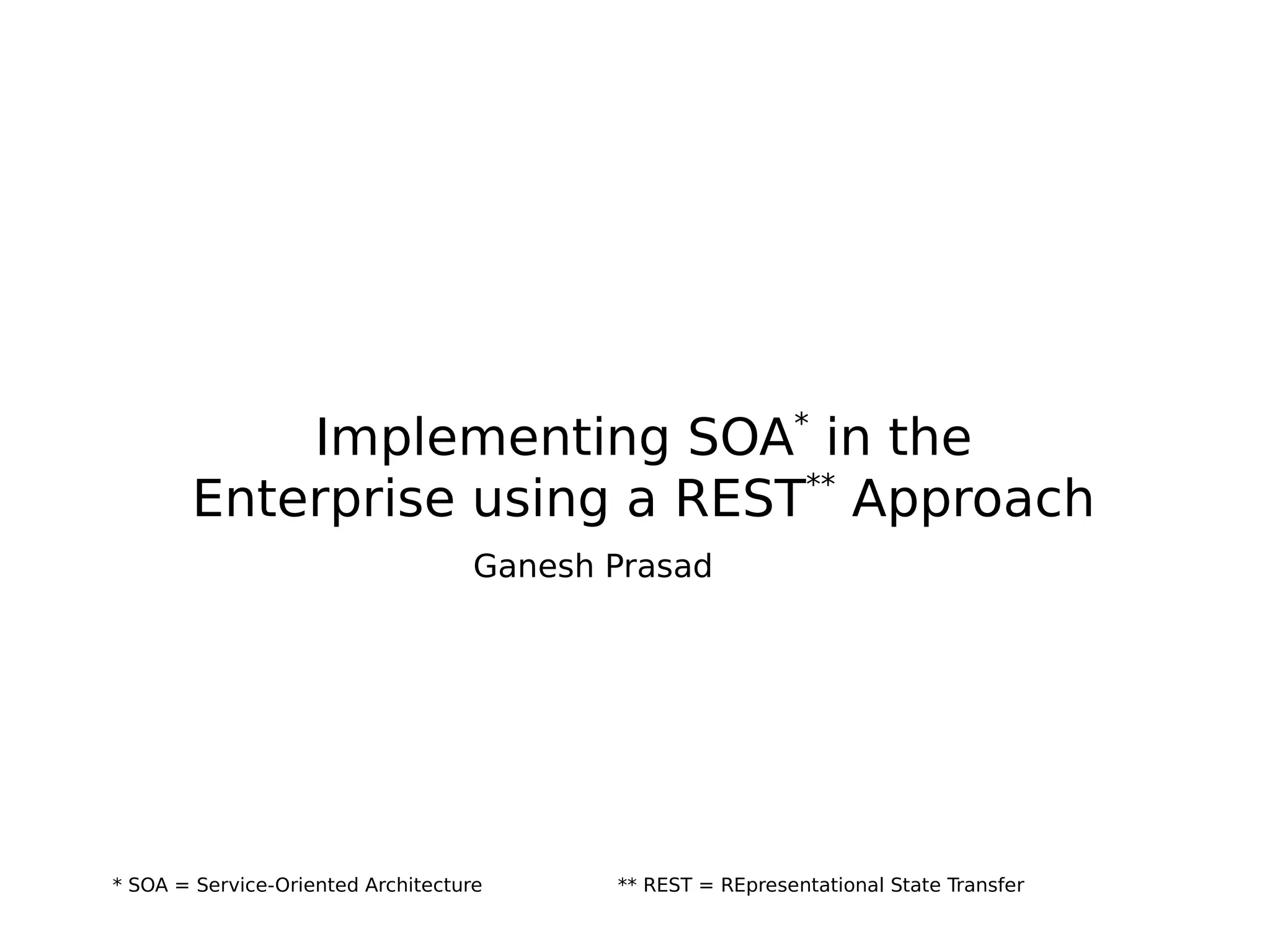 The document outlines a practical approach for implementing Service-Oriented Architecture (SOA) in enterprises using Representational State Transfer (REST) principles. It emphasizes the importance of explicit boundaries, resource identification, and the use of standard HTTP verbs for CRUD operations while addressing concerns about reliability, performance, and asynchronous communications. The presentation is tailored for enterprise architects looking to create a feasible SOA roadmap without the complexities of traditional protocols like SOAP.