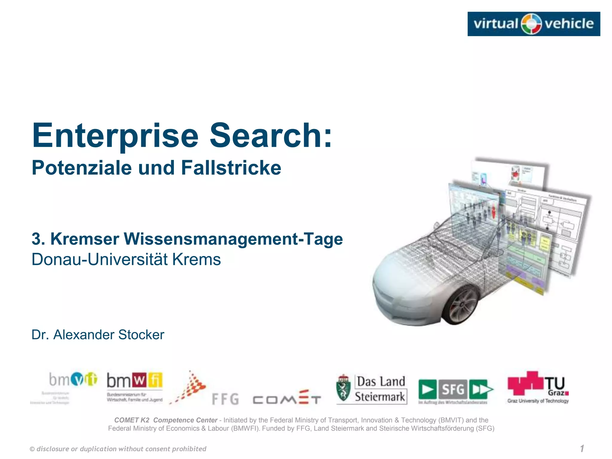 Das Dokument behandelt die Herausforderungen und Anforderungen an die Enterprise Search in Unternehmen, die durch verschiedene IT-Systeme und Wissensinseln kompliziert werden. Es wird erläutert, dass eine unzureichende Suchqualität und die Unkenntnis über die Struktur von Informationen sowohl die Produktivität der Mitarbeiter als auch die Entscheidungsfindung negativ beeinflussen können. Die Evaluierung der Nutzerzufriedenheit zeigt, dass die Suche nach relevanten Informationen oft schwieriger ist als die Navigation durch eine gut strukturierte Ordnerhierarchie.