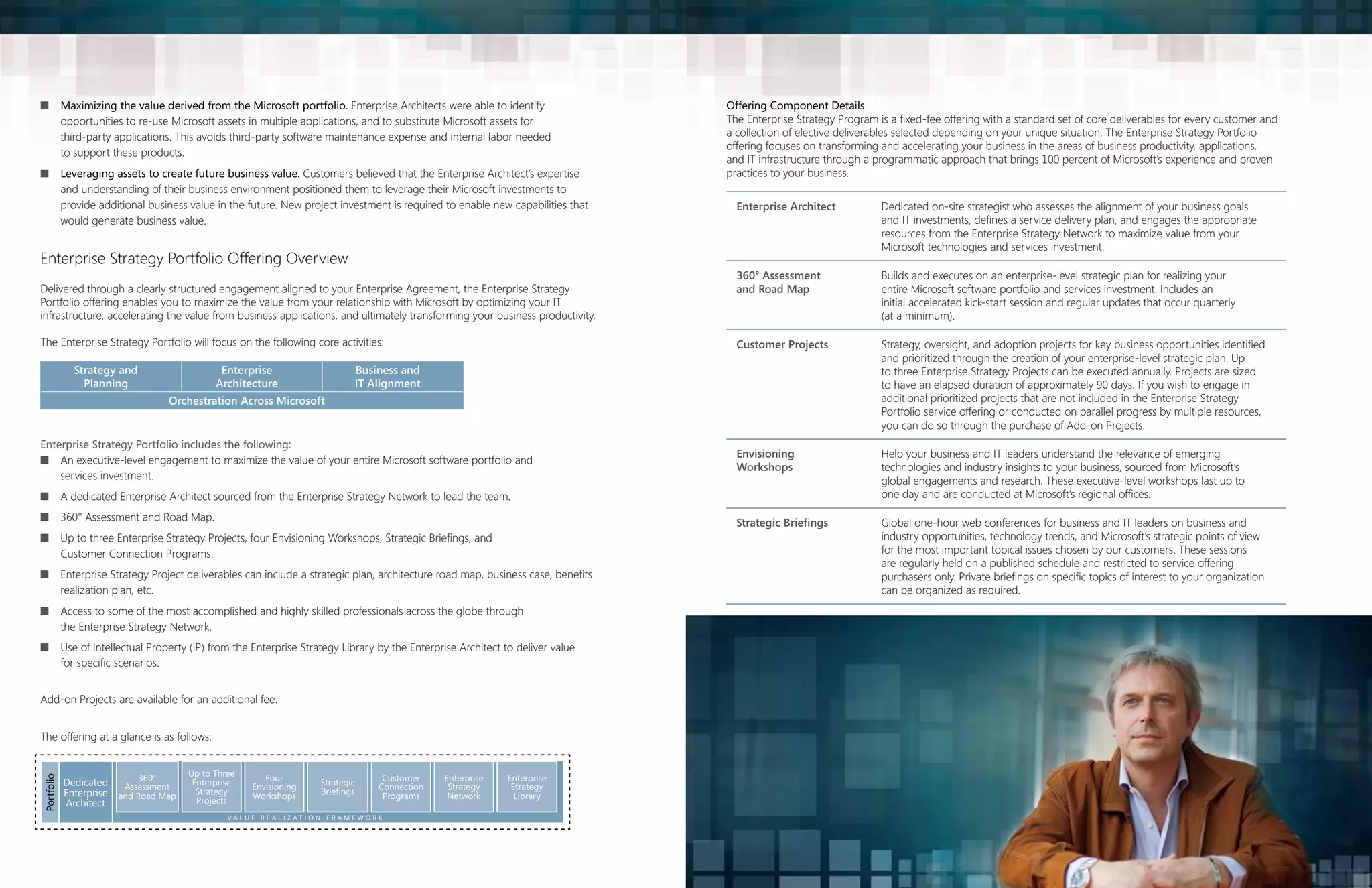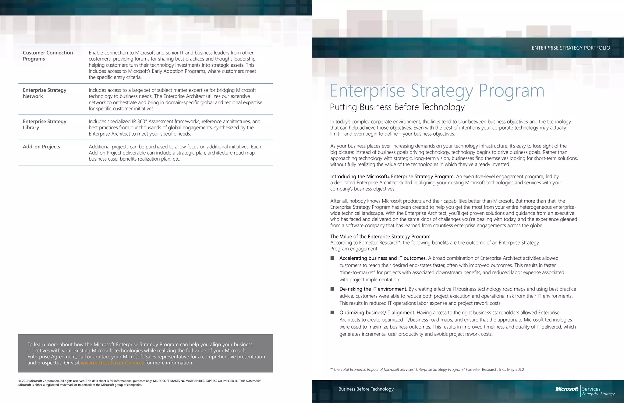 The document describes Microsoft's Enterprise Strategy Program which provides customers with access to expertise to help align their business objectives and strategies with their existing Microsoft technologies. The program includes access to customer networks, a library of best practices and reference materials, and additional customized projects. Forrester Research found that the program can help accelerate business outcomes, reduce risks, and optimize business-IT alignment.