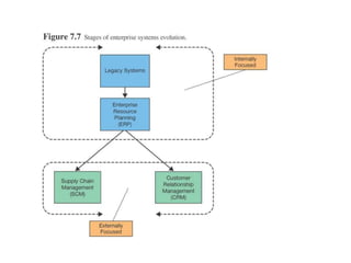 Enterprise systems integrate information across a company's operations on a company-wide basis. They provide a central repository for information that is common to all corporate users. These systems allow seamless sharing of information regardless of where the data is located. Interorganizational systems facilitate information flow between companies to streamline processes. Enterprise systems can be internally or externally focused to coordinate activities within a company or with external partners.