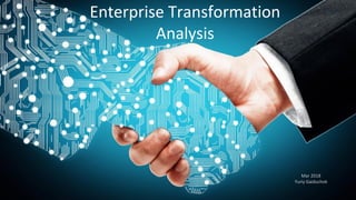 The document discusses enterprise transformation through enterprise analysis, business architecture, and the Zachman Framework. It begins by outlining enterprise problems like inability to innovate and losing to smaller competition. It then discusses the need for enterprise analysis to understand the current state of an organization. The document introduces business architecture and standards like BIZBOK and DODAF. It explains the Zachman Framework's rows and columns for classifying an enterprise's architecture using questions like what, how, where, who, when and why. The framework provides a comprehensive way to model all aspects of an enterprise.