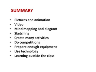 - It provides tips for incorporating entertainment in education, including using pictures, animation, videos, mind maps, diagrams, sketching, activities, competitions, equipment, and technology to engage students and make learning more fun and memorable.