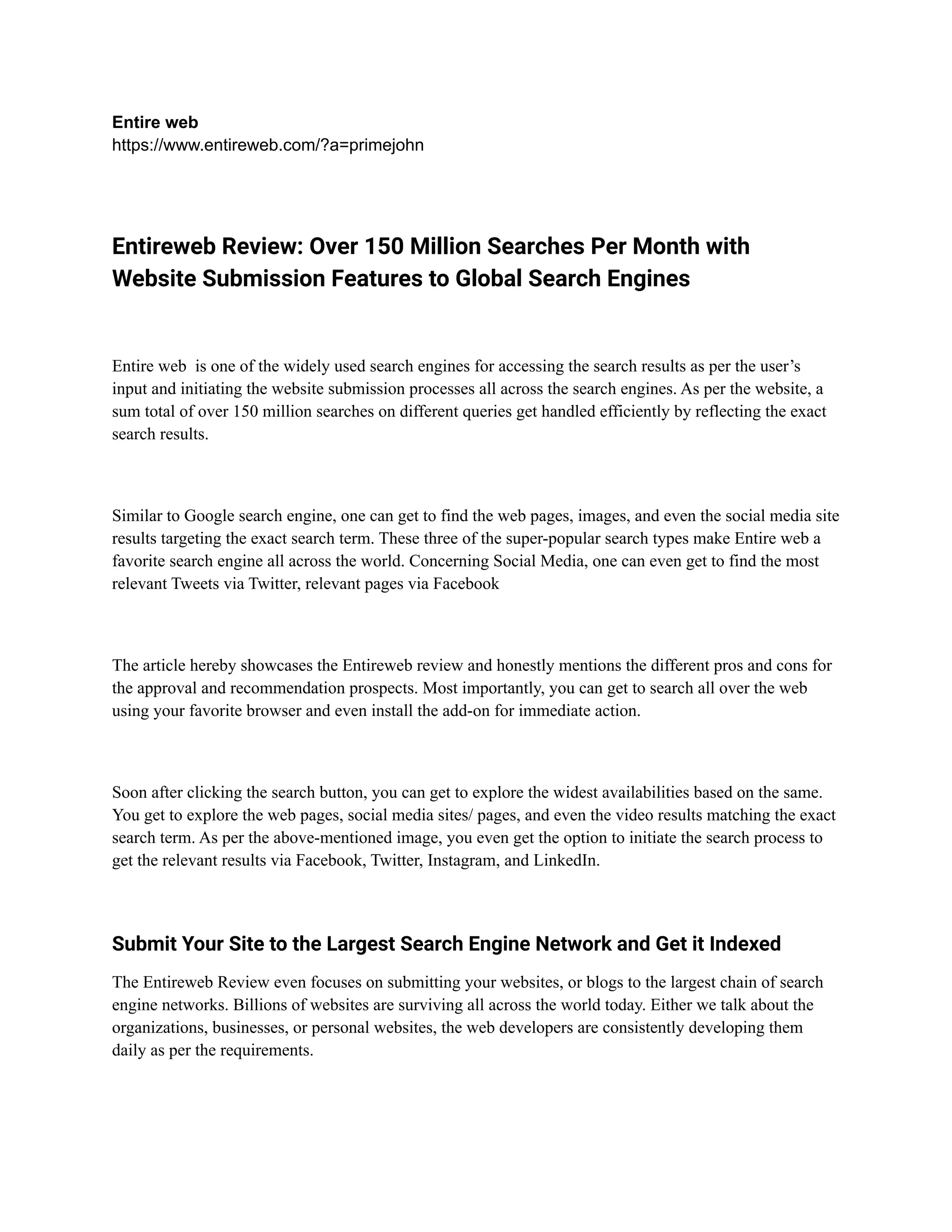 Entireweb is a search engine that handles over 150 million searches per month across various query types like web pages, images, and social media. It allows users to search across the entire web as well as directly within platforms like Facebook, Twitter, Instagram, and LinkedIn. Entireweb also offers a website submission feature that automatically submits user websites to major search engines like Google, Yahoo, MSN, and others, helping to get websites indexed more quickly and exposed to global search traffic. Submitting a website on the Entireweb console involves simply entering the URL and email address, then clicking proceed to instantly index the site on its network of search engines.