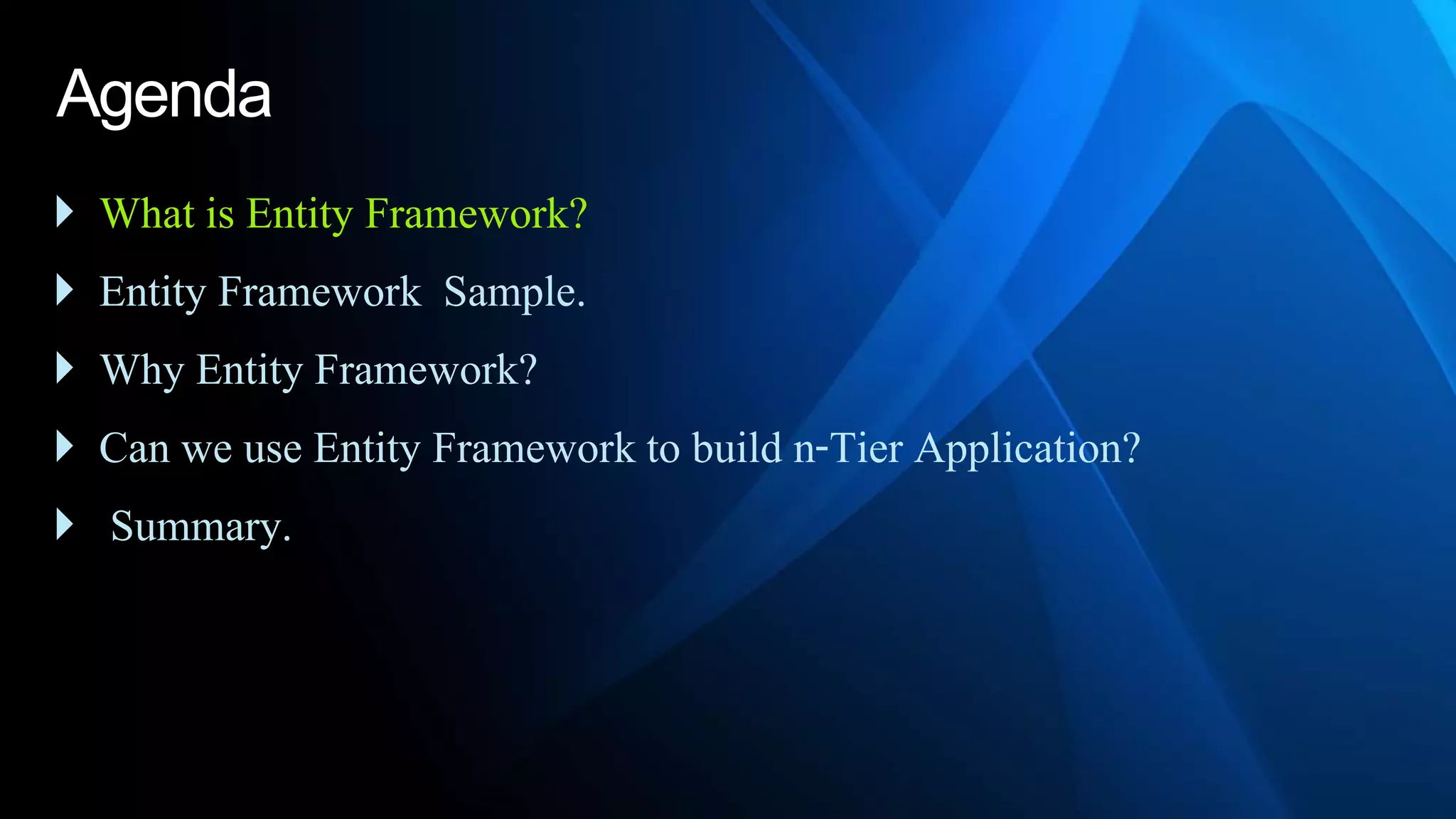 This document provides an introduction and overview of Entity Framework. It discusses what Entity Framework is, how it can eliminate data access code and allow developers to focus on business logic. The document demonstrates a sample Entity Framework application and compares it to other data access technologies. It also explains how Entity Framework integrates with .NET applications and supports n-tier architectures through the use of POCO entities and proxies.