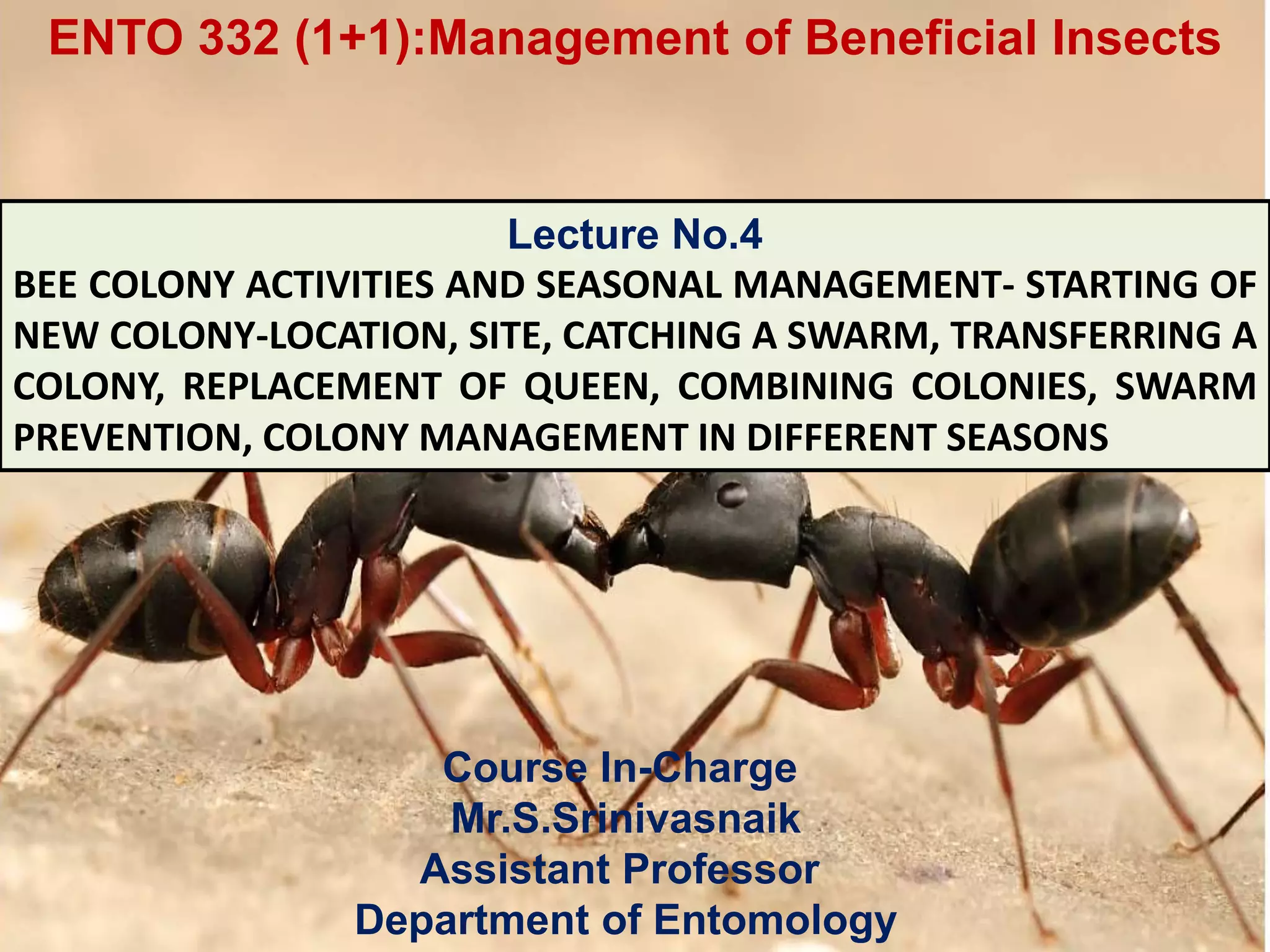 The document provides information about bee colony activities and seasonal management. It discusses starting a new colony by selecting an appropriate location with access to water and forage plants. It describes comb structure and functions. It explains swarming behavior and how to catch a swarm to start a new colony. It details seasonal management practices like providing space and feeding during honey flow season and uniting colonies.