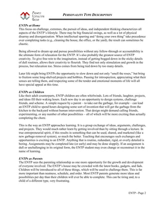 ENTPs are highly creative individuals who enjoy taking risks and pursuing new ideas and challenges. They see possibilities in everything and are always generating new ideas and alternatives. This makes them well-suited for entrepreneurial careers. However, ENTPs may struggle with follow-through and can frustrate others with their frequent changes of focus. As parents and leaders, ENTPs encourage growth and new experiences in others but can neglect routine tasks and expressions of affection in favor of intellectual pursuits.