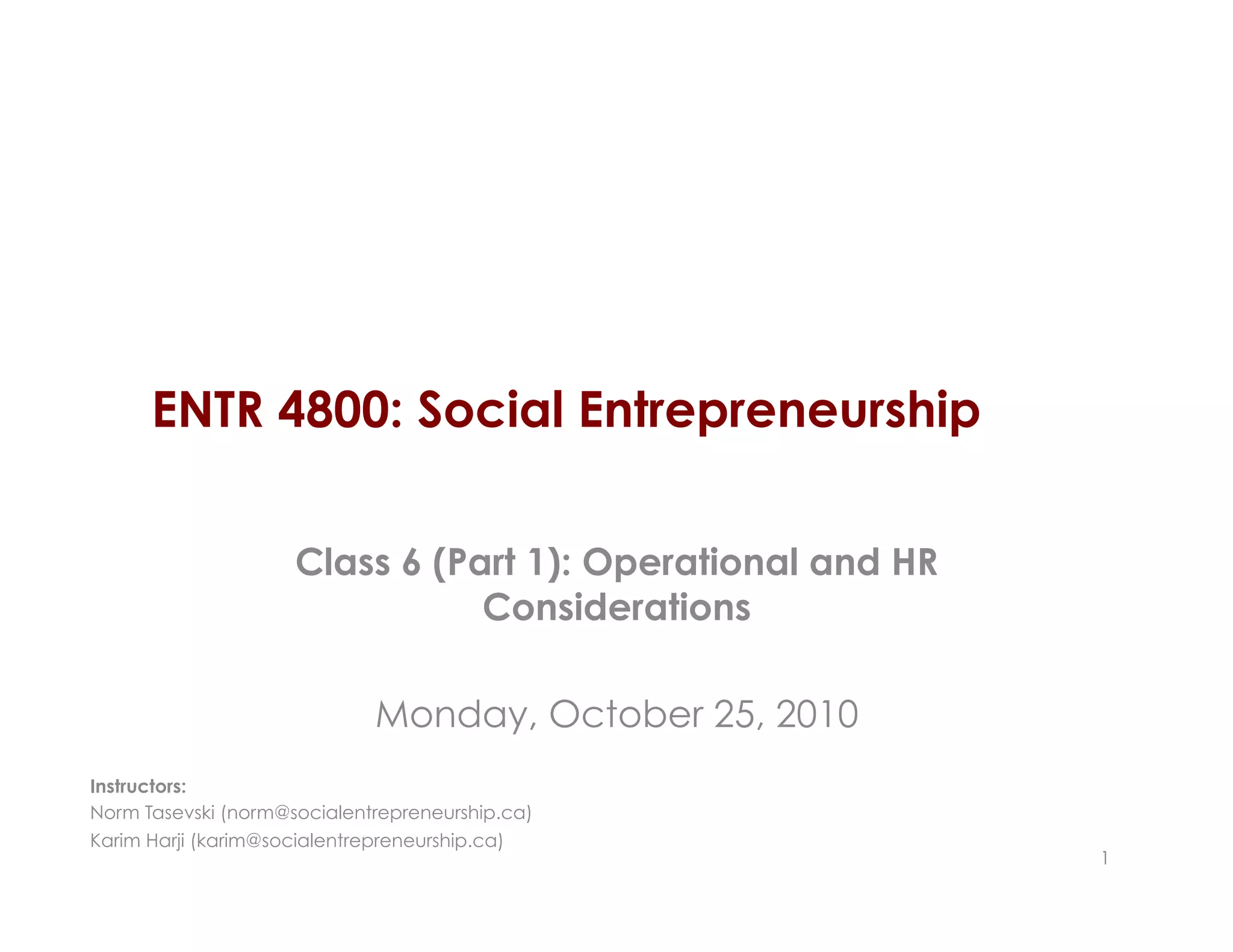 The document outlines key operational and human resources considerations for social entrepreneurship, discussing various business models and the importance of aligning HR strategies with organizational values. It poses critical questions regarding staffing, governance, and operationalization of business functions, while highlighting the balance between financial and social objectives. The appendix includes practical guidance on building a team, compensation structures, and effective HR practices.