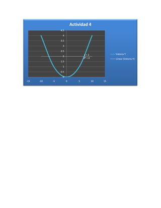 The document contains graphs of 4 activities. Activity 2 shows a parabolic graph with the equation Y=2X^2+10. Activity 3 is a histogram with ranges on the x-axis and frequency on the y-axis. Activity 4 displays a linear regression line with the equation y=2 and R2=0 along with scatter plot values.