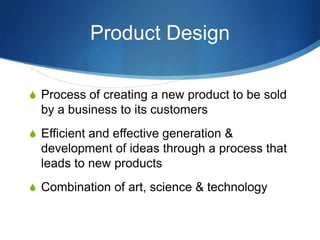 The document discusses product design processes and principles. It describes the typical 3-step product design process of analysis, concept, and synthesis. It also outlines several principles of good product design including doing something well rather than different, focusing on ideas, considering "what if" scenarios, and putting in extensive time and effort. Finally, it lists Apple's 11 design leadership principles such as being passionately committed to beauty, creating unique products, and designing with the user in mind.