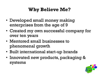 The document outlines essential rules and considerations for entrepreneurs based on the experiences of a seasoned entrepreneur, Thom Poole. It details the stages of a business cycle—from seed to exit—and emphasizes the importance of planning, understanding the market, knowing finances, and continually improving productivity. It concludes with steps for startup success and a validation of the entrepreneurial journey.
