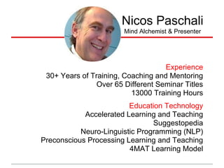 Nicos Paschali discusses entrepreneurial thinking in 3 dimensions: 1) Having a clear vision and passion for creating opportunities for others, 2) Thinking through formulation of ideas and using intellect, 3) Telling the story and testing ideas with others to find joy. Successful entrepreneurship requires focusing first on the why (vision and passion), then the how (execution), and allowing the what (results) to follow. No entrepreneur can succeed alone, so community and resources from others are also essential.