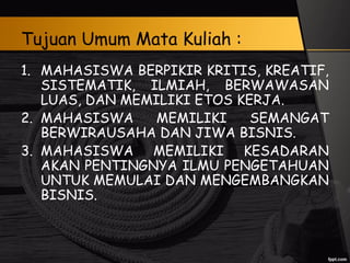 Dokumen tersebut membahas tentang tujuan dan kompetensi dasar mata kuliah kewirausahaan. Mata kuliah ini bertujuan untuk membentuk mahasiswa memiliki semangat berwirausaha dan jiwa bisnis serta memahami teknik pendirian usaha."