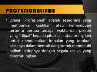 Dokumen tersebut membahas tentang entrepreneurship dan profesionalisme. Terdapat empat hal yang diperlukan untuk menjadi profesional yaitu ilmu dan pengetahuan, keterampilan, mental dan sikap, serta integritas. Dokumen ini juga menjelaskan tentang kepemimpinan, organisasi, manajemen, dan bagaimana mahasiswa dapat belajar menjadi pemimpin.