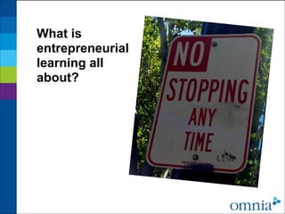 This document discusses entrepreneurial learning and its key characteristics. Entrepreneurial learning is non-linear, encourages learning from mistakes, and requires applying knowledge and skills to real-world problems. It promotes social skills and peer learning with outcomes that are visible. Entrepreneurial learning blurs roles where learners become participants and co-creators. Essential ingredients include contextual and mobile learning, project-based and gamified learning, and professional development for educators. Entrepreneurial thinking can be developed through social media challenges that bring together schools and communities.