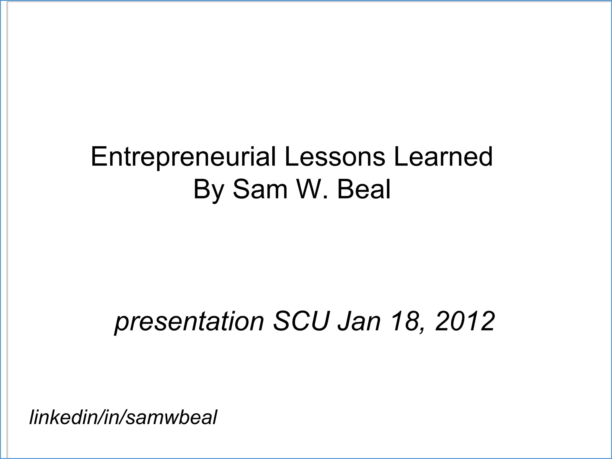 The document provides entrepreneurial lessons learned from Sam W. Beal's presentation including: