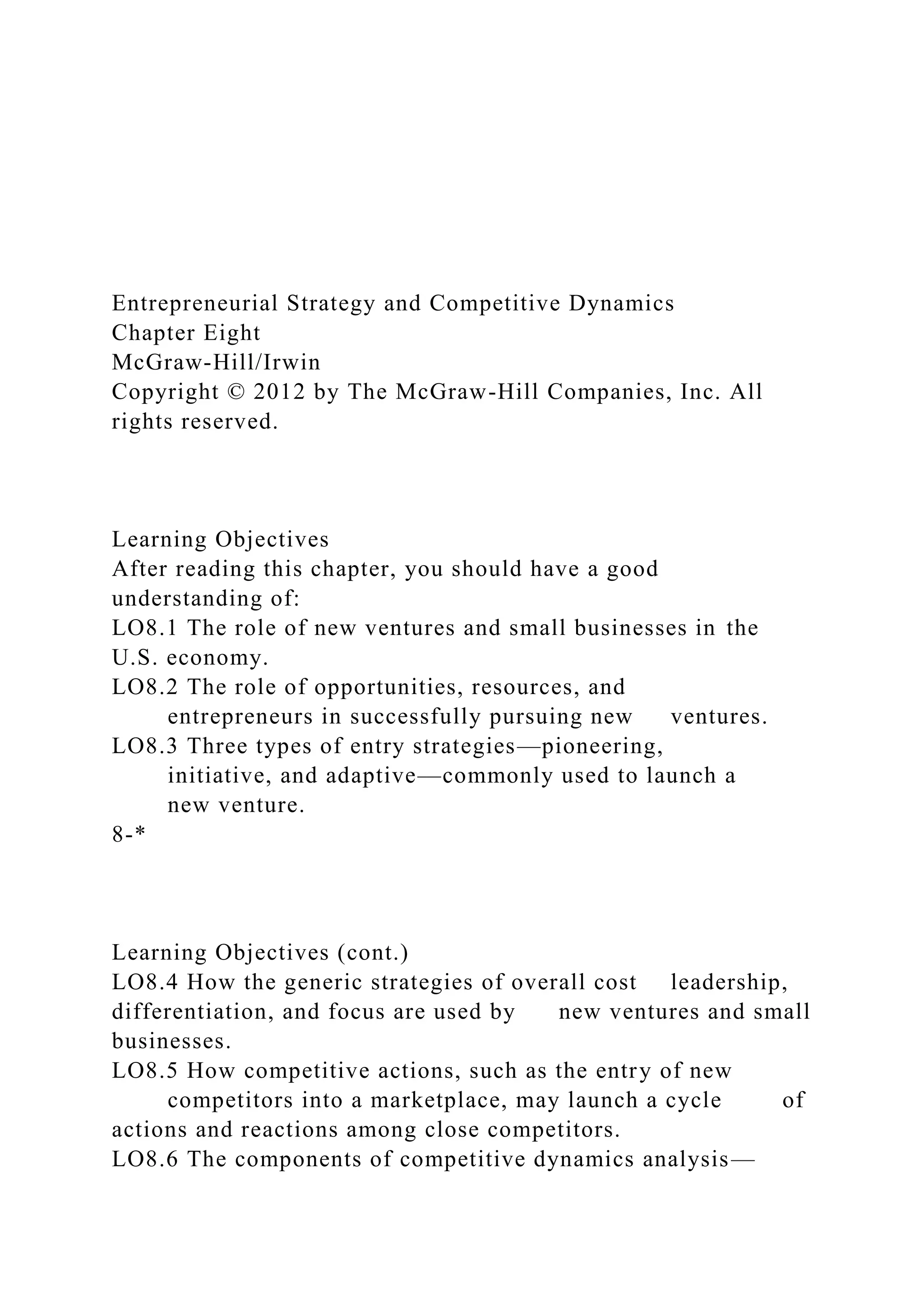 This chapter discusses the role of new ventures and small businesses in the U.S. economy, exploring how opportunities, resources, and entrepreneurs impact entrepreneurial success. It outlines various entry strategies and competitive dynamics, highlighting the importance of opportunity recognition and evaluation as well as the characteristics of viable opportunities. Additionally, the text emphasizes entrepreneurial leadership and strategic decision-making in the face of competition and market demands.