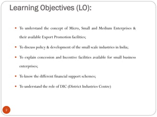 This document discusses entrepreneurial support systems for micro, small and medium enterprises (MSMEs) in India. It outlines how enterprises are classified based on investment levels, and describes various policy initiatives, financial support schemes, and the role of District Industries Centers in promoting MSMEs. Concessions, incentives, and export promotion facilities aim to generate employment, disperse industries across areas, and earn foreign exchange through supporting small businesses.