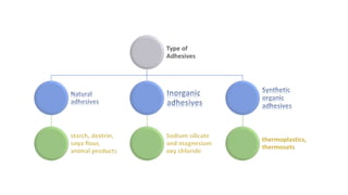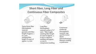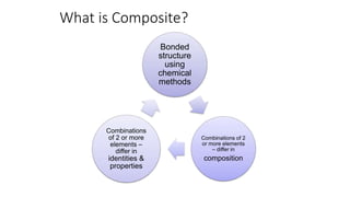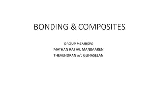 This document provides information about bonding and composites. It discusses the different types of composites including polymer matrix composites, metal matrix composites, and ceramic matrix composites. It describes the advantages and disadvantages of composites. It also outlines various fabrication processes for composites such as laminating, pultrusion, filament winding, and adhesive bonding.