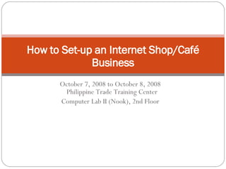 The document provides an outline for an entrepreneurship course on how to set up an internet café business. The course will cover the history and role of internet cafés, services offered, common equipment used, regulations, and how to establish an internet café business through market research, organization, financial planning, and technical aspects like installing software and networking computers. It will also feature a guest speaker discussing his experience as an internet café owner.
