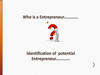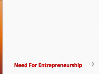 The document discusses the landscape of entrepreneurship in India, highlighting the challenges such as high unemployment and lack of skilled workforce, while identifying the need for effective entrepreneurial development. It categorizes various types of entrepreneurs based on characteristics, development stages, and technology usage, along with the role of government and educational institutions in fostering entrepreneurship. Additionally, it emphasizes the importance of incubation facilities and networks to support budding entrepreneurs and stimulate economic growth.