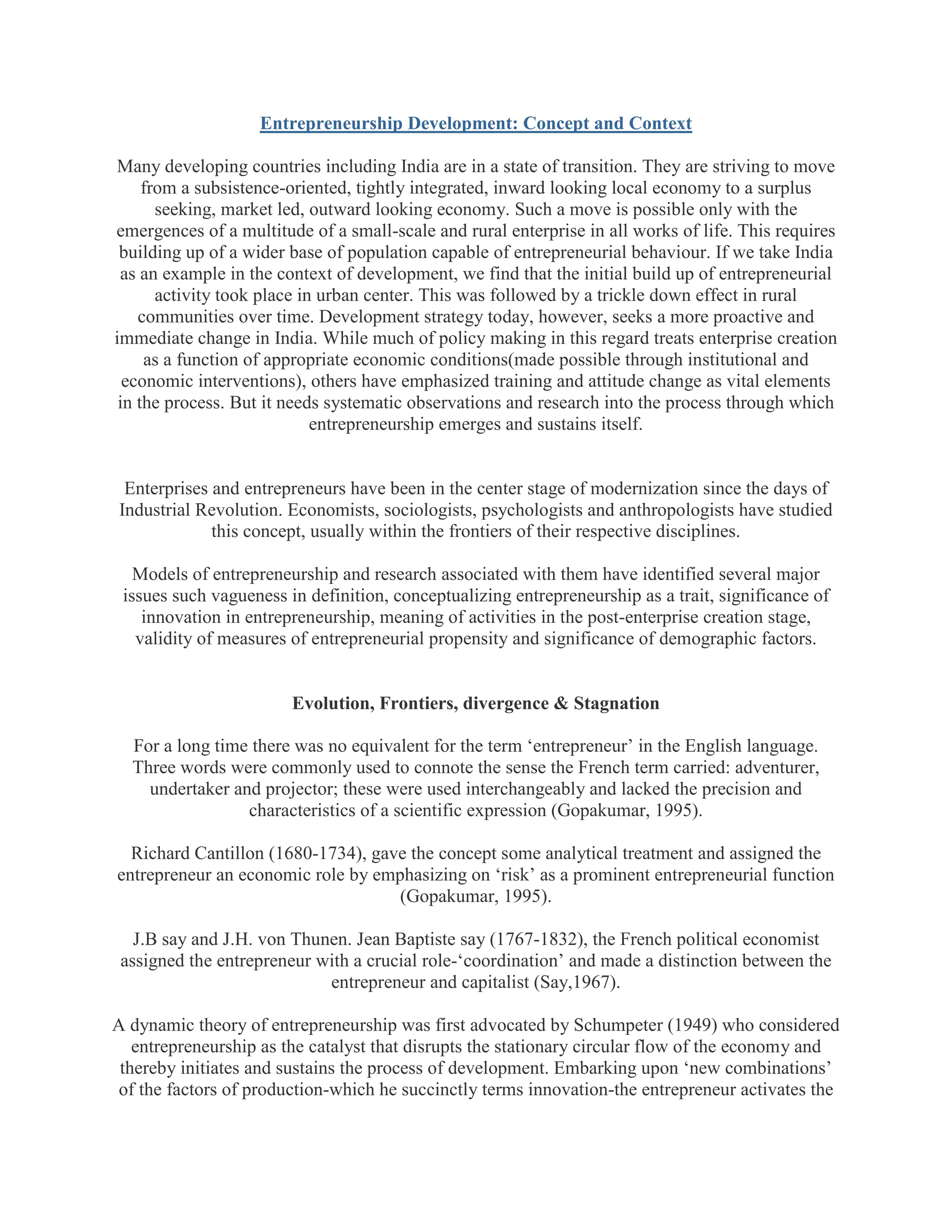 This document discusses the concept and context of entrepreneurship development. It provides an overview of how entrepreneurial activity has emerged in developing countries as they transition from subsistence to market economies. It then reviews several major theories and definitions of entrepreneurship proposed by economists and social scientists over time, focusing on risk-taking, innovation, and exploiting opportunities. Finally, it examines alternative socio-cultural, psychological, trait-based, and demographic approaches that have been used to understand entrepreneurial behavior.
