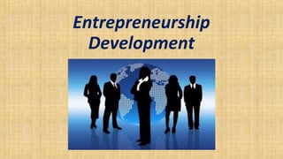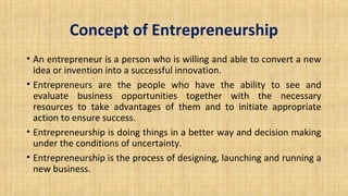 An entrepreneur is defined as someone who converts new ideas into successful innovations by seeing opportunities and taking advantage of them despite uncertainty. Successful entrepreneurs exhibit creativity, innovation, risk-taking, self-motivation, vision, and problem-solving skills. They generate ideas, promote their business, bear risks, arrange financing, hire staff, and manage crises. The entrepreneurial process involves deciding to become an entrepreneur, identifying opportunities, developing a business plan, determining required resources, and managing and growing the enterprise. Barriers to entrepreneurship include a lack of capital, labor, materials as well as social norms and lack of sustained motivation, vision, and clear ideas.
