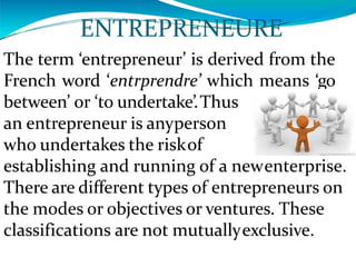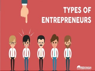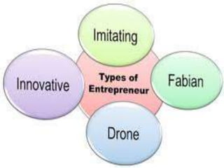 This document discusses different types of entrepreneurs. It categorizes entrepreneurs based on the type of business, stage of development, motivation, technology used, capital ownership, gender/age, area, scale, and other classifications. The main types discussed are business, trading, corporate, agricultural entrepreneurs based on business type. First generation, second generation, and classical entrepreneurs are discussed based on stage of development. Pure and induced entrepreneurs are discussed based on motivation. The conclusion states that entrepreneurs organize resources to establish businesses and drive economic development through industrialization.