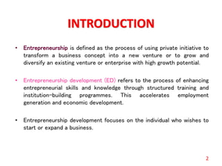 This document provides an overview of entrepreneurship development. It defines entrepreneurship as using private initiative to start a new business or grow an existing one. Entrepreneurship development focuses on training and programs to enhance entrepreneurial skills and knowledge to generate employment and economic growth. The document discusses the characteristics of entrepreneurs, competencies needed for entrepreneurship like knowledge, skills, attitudes, and factors to consider when starting an enterprise such as market assessment, growth strategies, and profitability measures. It emphasizes the important role of entrepreneurship in strengthening economic growth and modernization.