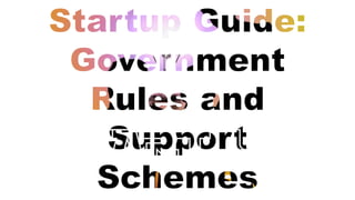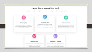 This document provides an overview of the Indian startup ecosystem and key government support schemes. It defines a startup ecosystem as the people, organizations, and interactions that help create and scale new companies. The government of India has launched several initiatives to develop a robust startup culture, including the Atal Innovation Mission, Multiplier Grant Scheme, Dairy Entrepreneurship Development Scheme, Startup India Seed Fund Scheme, and Startup India Initiative. These schemes provide funding, subsidies, tax benefits, and other services to help startups in sectors like health, agriculture, and manufacturing. The document concludes that over 100,000 startups in India have benefited from the various government regulations and support programs.