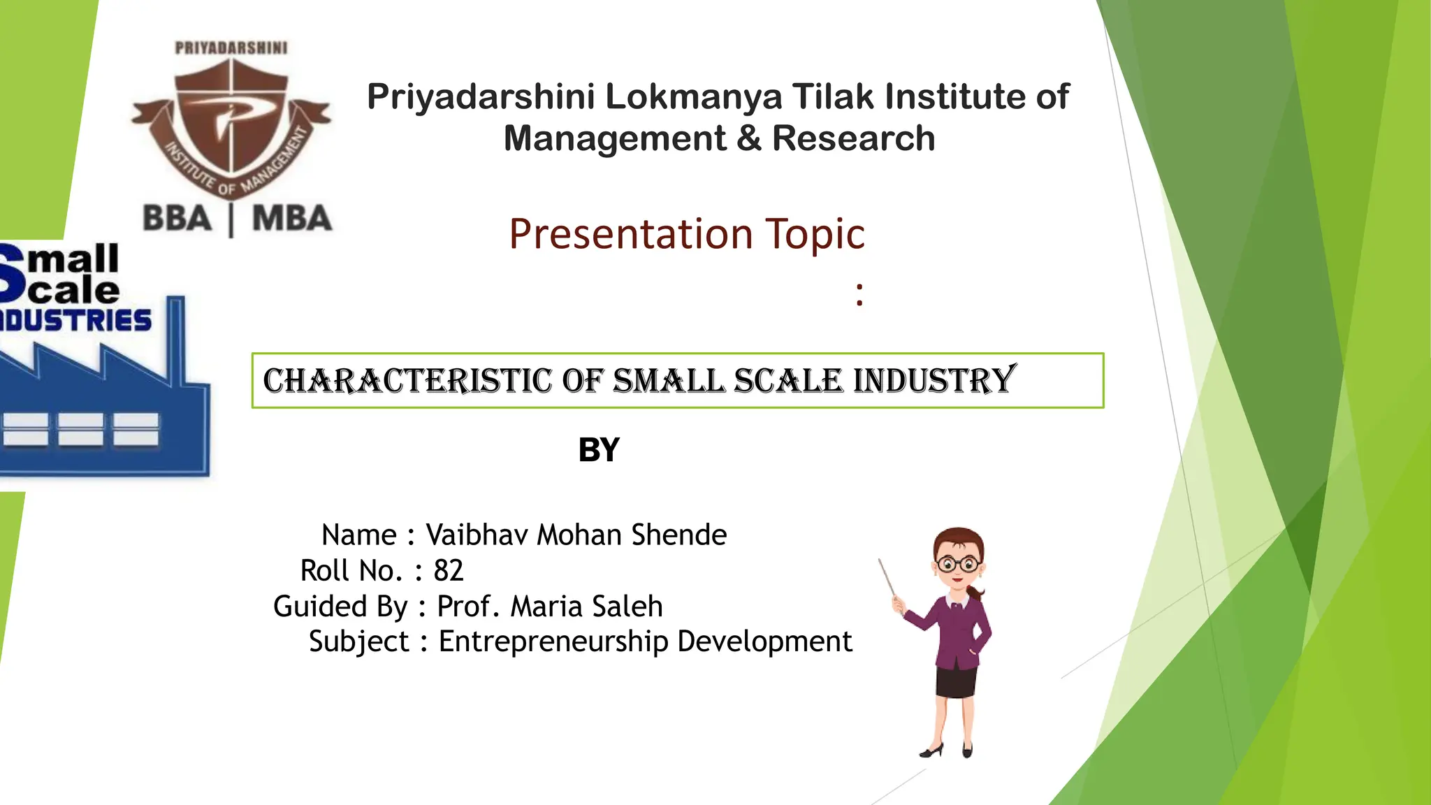 Small scale industries are characterized by small ownership and management, flexible operations, optimal use of local resources, and restricted geographic operations. They provide important economic benefits such as job creation, entrepreneurship development, and meeting local demands. Some key characteristics of small scale industries include private or family ownership; reliance on labor over capital; flexibility to adapt quickly to changes; integration of management and ownership; making best use of available resources; and limiting operations to local areas. Small industries play a significant role in Indian economic development by providing over 60-70% of innovations and serving as an incubator for entrepreneurs and future large companies.