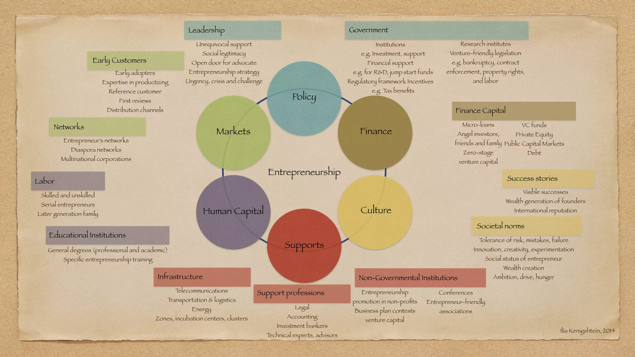The document discusses the critical components of entrepreneurship, emphasizing the role of human capital, market support, and financial resources in fostering successful ventures. Key elements include the influence of culture, government policies, and societal norms on entrepreneurial activity, as well as the importance of networks, training, and legal frameworks. It highlights various sources of financial support, such as micro-loans and venture capital, in driving innovation and wealth creation.