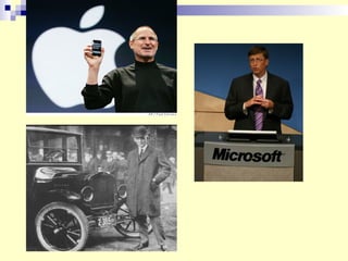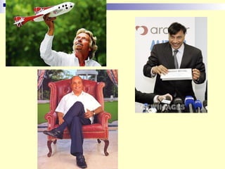This document discusses entrepreneurs and what defines them. It provides examples of entrepreneurs who have achieved great success at a young age, such as Mark Zuckerberg who co-founded Facebook at age 22. The document highlights that entrepreneurs take calculated risks to realize their aspirations and create value by listening to their heart. They are uniquely defined by changing the world, their country, or an industry through pursuing their entrepreneurial ideas.