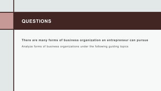 This document discusses different forms of business organizations that an entrepreneur can pursue, including sole proprietorships, partnerships, private limited companies, public limited companies, and holding companies. It provides details on the key features, advantages, and disadvantages of each type of business structure. Sole proprietorships are owned by one person who is solely responsible for risks and profits/losses. Partnerships involve two or more owners who share risks, profits, and losses. Private and public limited companies separate the business from its owners, who have limited liability. Holding companies control other companies as subsidiaries.